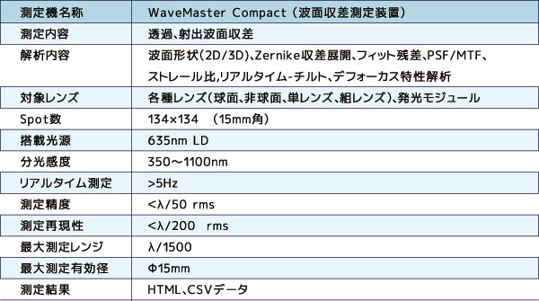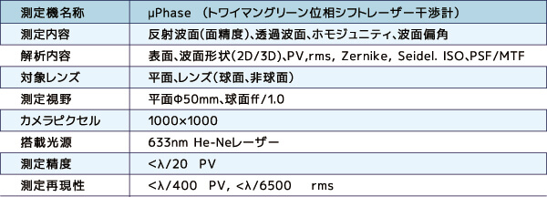 形状・波面収差計測サービスは各種レンズ・平面光学部品、レーザー発光モジュールなどを対象に、面形状・波面収差の計測・評価を行います。光学設計図面とレンズデータをお送りいただければ、当社で波面収差をシミュレーションし、測定値との比較も可能です。計測のご依頼をされる場合は、専用フォームよりお申し込みください。